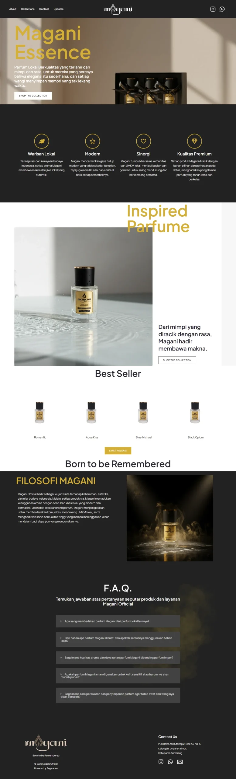 Magani Parfume adalah Toko Parfum yang sebelumnya menjual produk melalui offline dan shopee. karena biaya admin di platform marketplace mahal, owner magani memutuskan untuk membuat website katalog.
